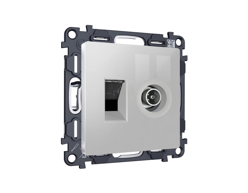 Комплект механизма розетки компьютерной + TV оконечной RJ-45 (8P8C) CAT6/50-870 MHz 1dB с автоматической защитной шторкой ALFA MA412510 Серебро глянец QUANT (AP4125, VM195)