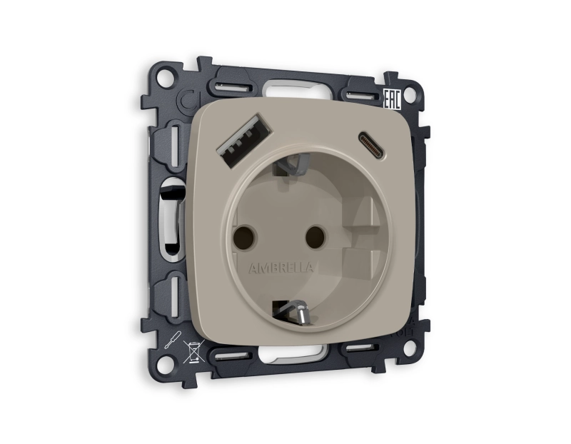 Комплект механизма электрической розетки OMEGA MO370010 Серо-бежевый матовый 2USB A+C 20W 3000mA (быстрая зарядка) 180-220V/50Hz (5V3A, 9V2.22A, 12V1.66A) с заземлением на винтовых зажимах 16A-250V 50Hz 2P+E QUANT (OP3700, VM160)