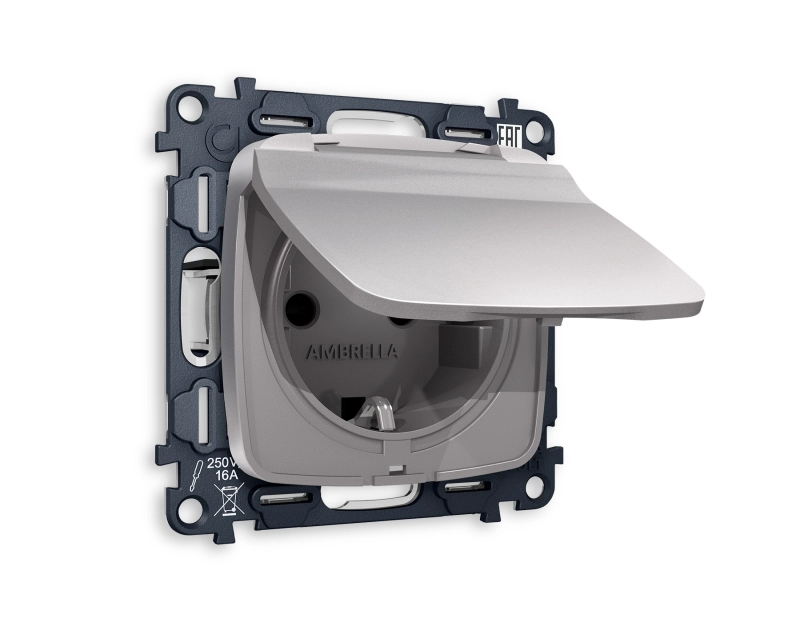 Комплект механизма электрической розетки OMEGA MO508010 Сталь матовый 16A-250V 50Hz 2P+E с заземлением, шторками и защитной крышкой IP44 QUANT (OP5080, VM141)